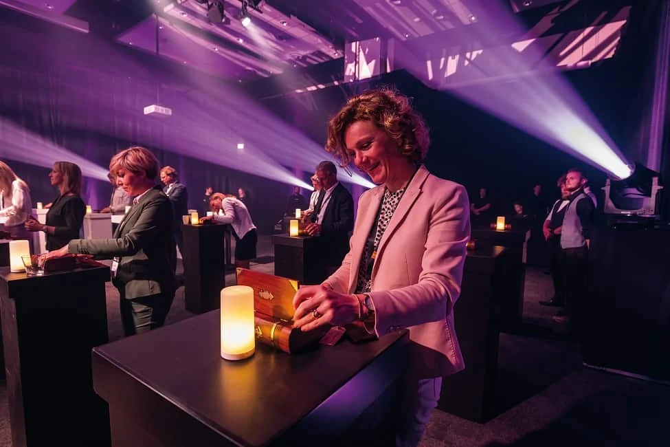 Als afsluiting werd er een finale gehouden in een met rook gevulde ruimte met schitterend licht en bijpassend geluid. Ook hier weer de toegevoegde waarde van techniek en decor. Voor iedere deelnemer was er een plaats achter een sokkel waar een kistje op stond. André hield iedereen nog eens een spiegel voor: “Nu is het moment voor verandering. Nu kunnen we eindelijk die oude gewoontes wegdoen. Zorg ervoor dat een event een echte ervaring wordt!” En om de lessen van vandaag te onthouden kon iedereen het kistje voor hem openen met een sleutel die hij eerder had gekregen. Daarin bevond zich een munt om de deelnemer aan deze ervaring te herinneren. De deelnemers van de ochtendsessie werden uitgenodigd om bij een lunch na te praten. Of zoals André zei: “Veel onderdelen van een event kunnen, mogen of moeten veranderen, maar er zijn zaken die de moeite waard zijn om te bewaren.”