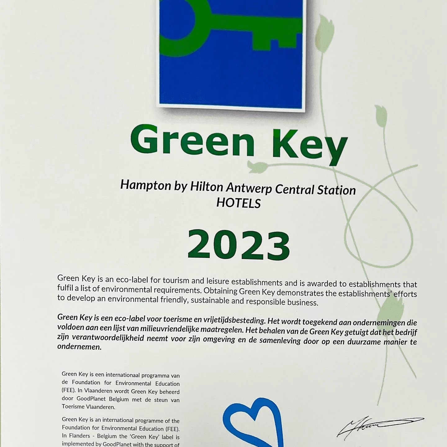 Wij zijn erg trots nu officieel gecertificeerd te zijn voor het internationale duurzaamheidkeurmerk Green Key en zo de belofte van Hilton “Travel with Purpose” aan ons team, de gasten en leveranciers waar te kunnen maken.