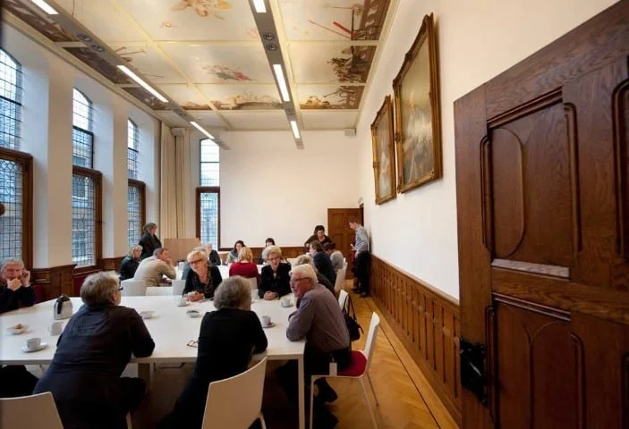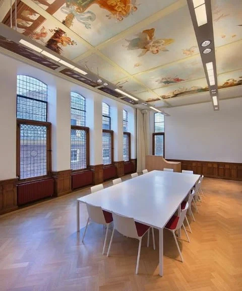 Stiekem wegdromen tijdens een vergadering? Dat is beslist geen straf in onze Laarwoudzaal. De voormalige Commissiekamer uit 1901 ademt namelijk geschiedenis. De originele eikenhouten lambrisering en de deuren nemen je moeiteloos mee terug in de tijd. Letterlijk en figuurlijk is het plafond, geschilderd door Fabri, het hoogtepunt van de Laarwoudzaal!