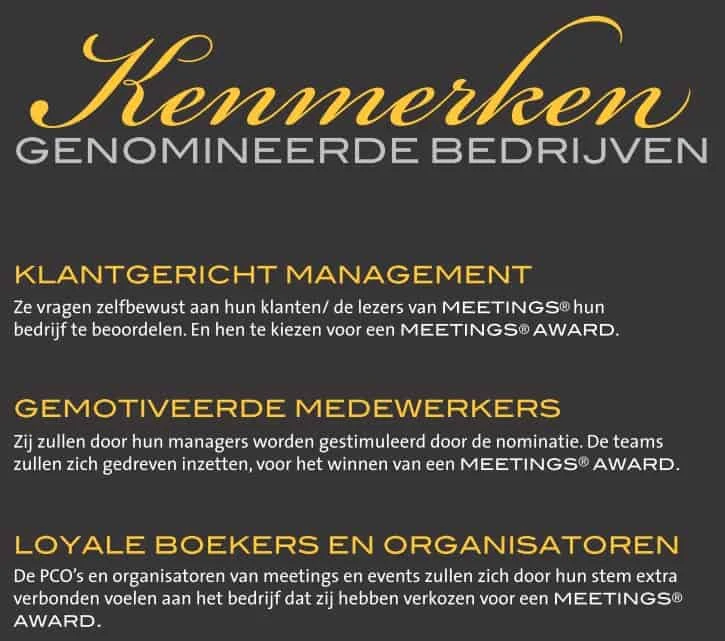 Informatie voor deelnemers: De MEETINGS® Awards zijn een heel mooie marketingtool ten behoeve van een klantgericht management, gemotiveerde medewerkers en loyale boekers en organisatoren. Heeft u een locatie en wilt u meer informatie over deelname? Neem dan contact: info@brinkmanmediagroup.nl