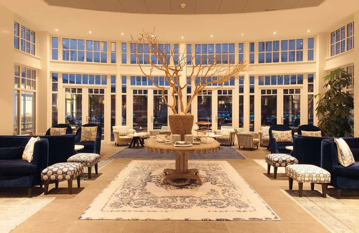 Achter een fraaie façade van Zeeuwse geveltjes bevindt zich een exclusief Grand Hotel. Hier kunt u gebruikmaken van vier recent gerenoveerde zalen, die onderling te combineren zijn. In theateropstelling kunnen hier groepen van  maximaal 250 personen vergaderen. Uiteraard zijn de zalen volledig flexibel in te delen, waardoor altijd de juiste opstelling kan worden gerealiseerd. Ook zijn er twee boardrooms voor vergaderingen met een klein gezelschap. De  audiovisuele faciliteiten zijn grotendeels mobiel, waaronder grote schermen. “Op deze manier kan er snel worden  ingespeeld op de wensen van de klant”, zegt Jelle. “Zo staat er altijd de juiste apparatuur, die eenvoudig kan worden  bediend.” Het is mogelijk, Grand Hotel ter Duin exclusief te boeken. In dat geval heeft u niet alleen de beschikking over  de zalen, maar kunt u ook gebruik maken van de gezellige lobby. “In onze lobby kunt u tachtig tot tweehonderd personen ontvangen”, vertelt Jelle. “In de lobby heerst een prettige, ontspannen en informele sfeer. Daarnaast zijn bij een exclusieve boeking ook het grand café en het restaurant voor u beschikbaar.” Grand Hotel ter Duin is zeer ruim opgezet. De receptie en de lobby gaan in elkaar over en beschikken over veel daglicht. Het daglicht zorgt ook voor