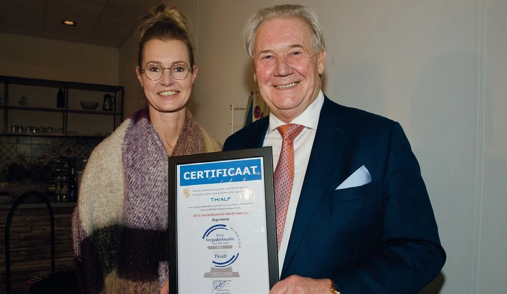 Foto: Inge en Jan van ‘t Hooge (eigenaren) van Thialf/Catering van ‘t Hooge winnen brons in de categorie Beste Vergaderlocatie (nationaal) en zijn regionaal winnaar voor de regio Noord geworden.