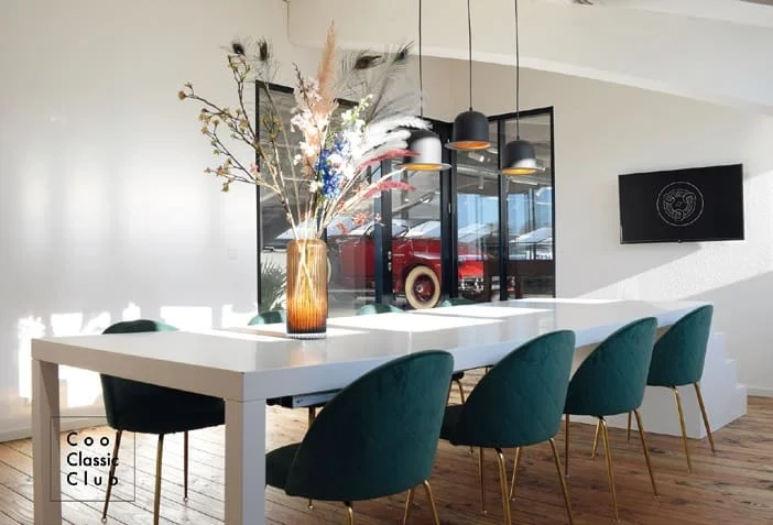De unieke locatie in Naarden ademt een industriële sfeer. Er zijn twee boardrooms, waarvan de grootste ruimte geschikt is voor vergaderingen tot acht personen. De showroom zelf biedt ruimte aan maximaal vijftig gasten. Niet alleen de klassieke automobielen geven een boost aan uw meeting, ook de koffie is perfect. “Wij schenken megagoede koffie, geen motorolie”, lacht Thies. Synergie, daar draait het om bij Cool Classic Club. Mensen ontmoeten omringd door een mooie omgeving vol passie en tegelijk ook de rust die een vergadering nodig heeft. De omgeving wordt verder verfraaid door kunst – de derde k, naast klassiekers en koffie. “Hier hangt kunst van gevierde Europese kunstenaars.”Cool Classic Club is de perfecte locatie voor wie in klein gezelschap net even een andere vergadering wil organiseren. Een smakelijke lunch vormt naast de koffie de versterking van de inwendige mens. En benut de pauze tussen twee programmaonderdelen om de kunst te bewonderen en… een proefritje te maken met de auto waarvan u dacht dat u er nooit in zou rijden.