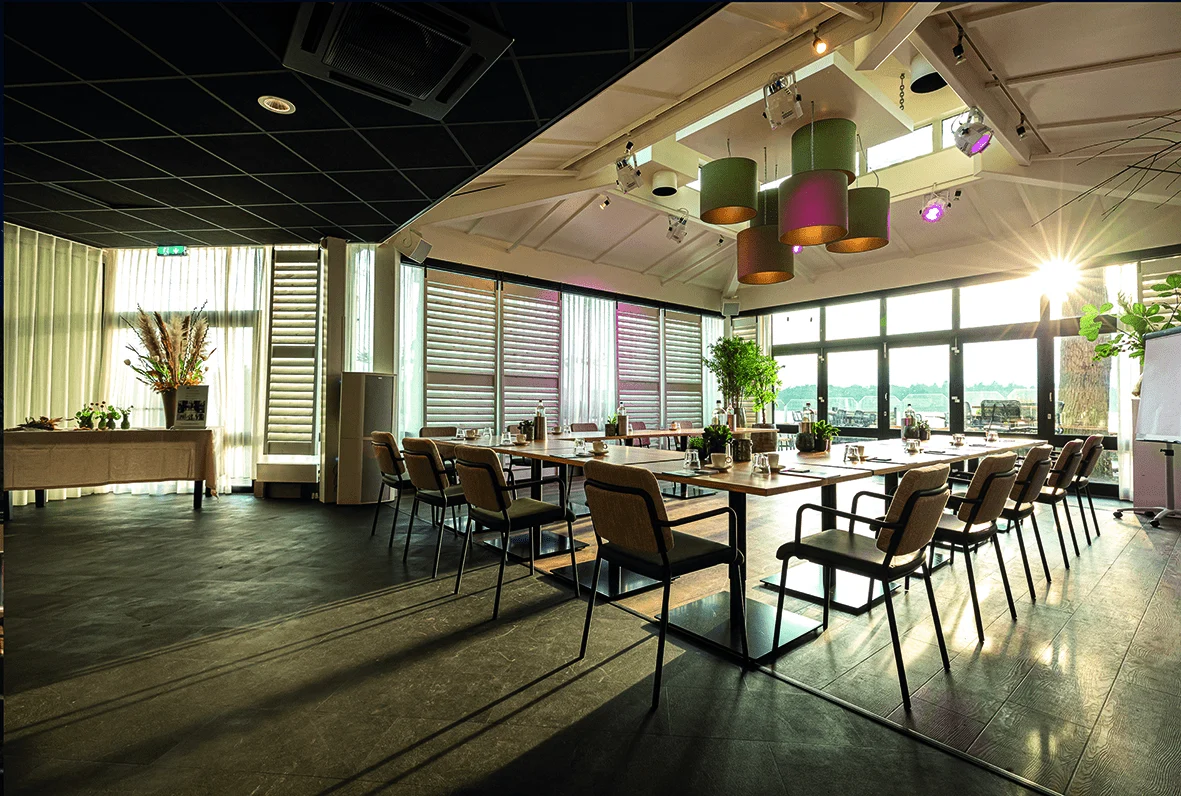 De evenementenlocatie wordt onder andere gebruikt voor zakelijke bijeenkomsten en omvat in totaal 500 vierkante meter vrije ruimte, eventueel onder te verdelen in drie zalen met ieder een eigen terras. Hier kunnen, in tijden van COVID-19, 120 personen terecht. De audiovisuele installatie maakt het voor iedereen mogelijk om dezelfde spreker te zien en horen. Vergaderingen faciliteren, met een spreker op afstand, is tevens mogelijk dankzij de aanwezigheid van twee Legamaster touchscreens. Om het aanraken van de schermen te voorkomen kun je deze met je eigen computer via Wi-Fi of bluetooth verbinden. De schermen zijn zodanig groot dat meekijken op gepaste afstand geen enkel probleem is.