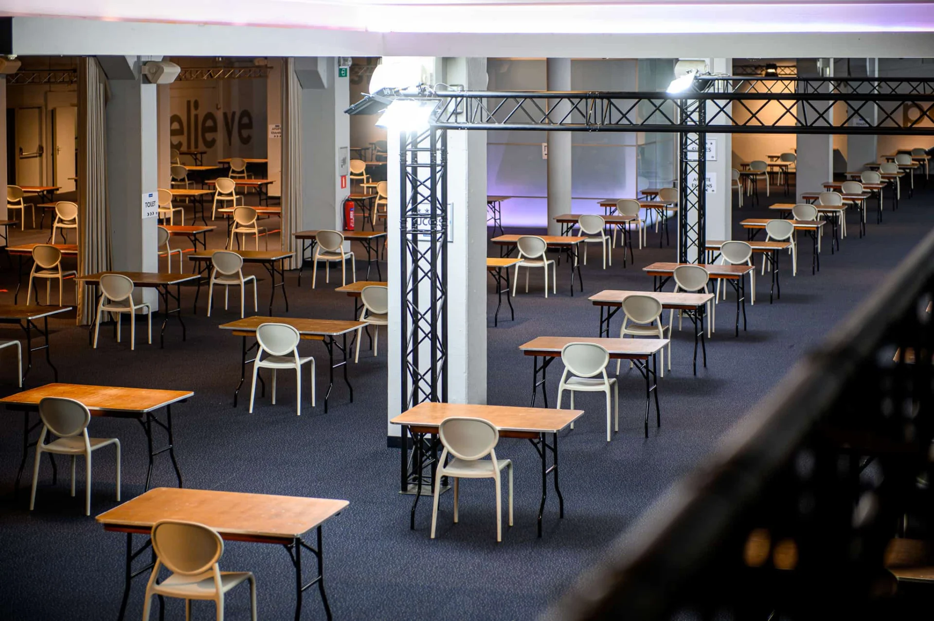 Door een nauwe en vlotte samenwerking tussen KU Leuven en Kinepolis Antwerpen werd deze receptieruimte in sneltempo volledig omgevormd tot een veilige examenruimte rekening houdend met de verschillende veiligheidsmaatregelen. Zo werd er gezorgd voor onder andere aparte in- en uitgangen, signalisatie, handgel, scheidingswanden, extra verlichting en stewards die alles mee in goede banen leiden om de nodige social distancing te garanderen. We wensen de studenten alvast enorm veel succes!