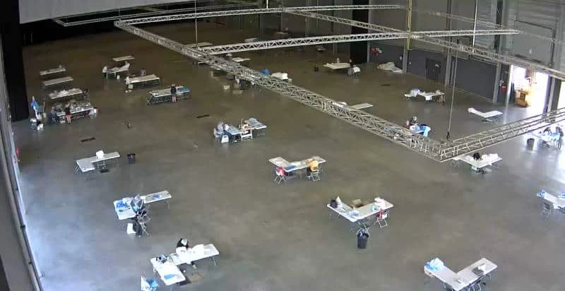 De hal ‘Louvexpo’ is omgebouwd (getransformeerd) tot een gigantisch atelier van ‘Coupe & Couture’: vrijwilligers met hun naaimachines maken hier veiligheidsuitrustingen voor het zorgpersoneel.