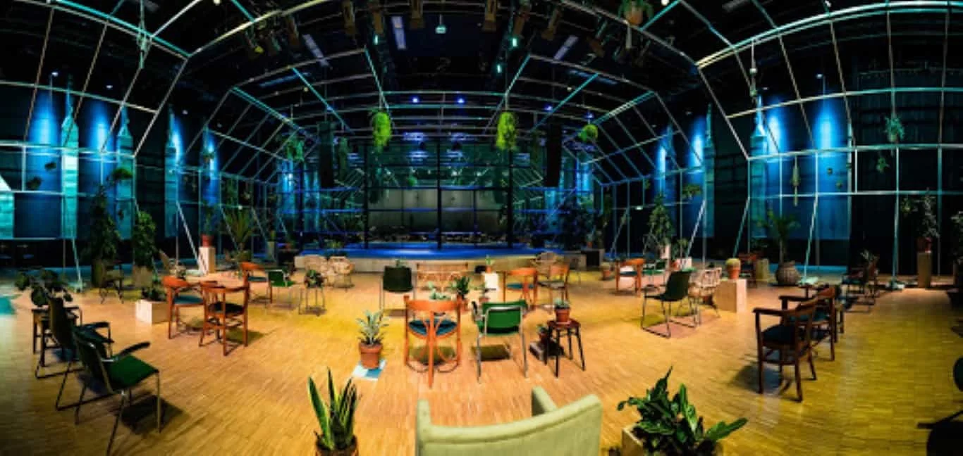 De twee ervaren scenografen Wikke & Marloes uit Amsterdam hebben op briefing van De Harmonie drie fantastisch nieuwe zaalconcepten uitgewerkt. Alle drie de zalen ademen een sfeer van lucht, licht en het gevoel van buiten. Ze zijn vanuit deze thema’s opnieuw vormgegeven en ingericht. Stuk voor stuk een kunstwerk op zichzelf. Overal is er een beleving van natuur, ruimte en frisheid en de strenge scheiding tussen podium en zaal is verdwenen; de act is onderdeel van het publiek. Zoals in de grote zaal, waar het publiek zich in een weelderig duinlandschap rond de cabaretier of muzikanten schaart. Van der Woude: ‘De arena-opstelling vergroot de beleving van het samen genieten van kunst en cultuur: de artiesten worden meer ‘aanraakbaar’, de beleving wordt persoonlijker, tussen artiest en publiek en tussen de bezoekers onderling. Je zou kunnen zeggen, dat we het ‘festivalgevoel’ in een veilige setting van buiten naar binnen halen. Zo kunnen we straks samen weer op adem komen in een nieuwe inspirerende omgeving.’
